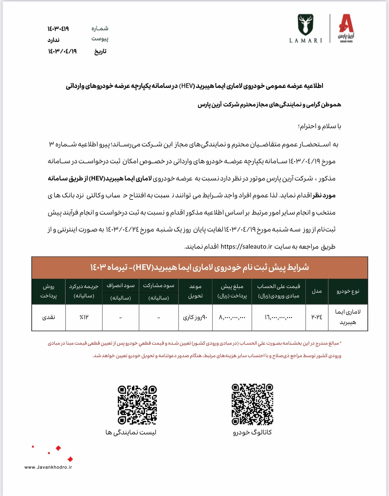 شرکت آرین پارس موتور در نظر دارد نسبت به عرضه خودروی لاماری ایما هیبرید HEV از طریق سامانه یکپارچه خودروهای وارداتی اقدام کند.