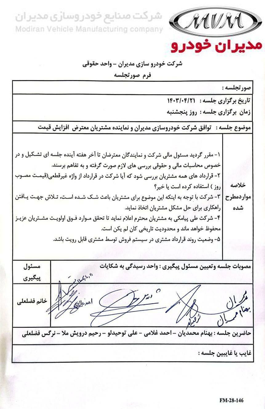 لازم به ذکر است که مشتریان مدیرانخودرو خودروهایشان را با قرارداد قیمتی غیرقطعی و منوط به احتمال تغییرات حقوقو عوارض دولتی خریداری کردهاند و این موضوع در قراردادهای خرید نیز ذکر شده است.