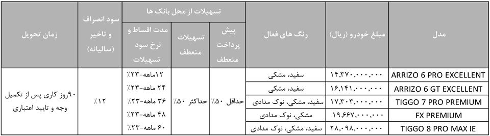| تیگو 8 پرو پریمیوم | 2 میلیاردو 269 | حداقل 60 درصد |