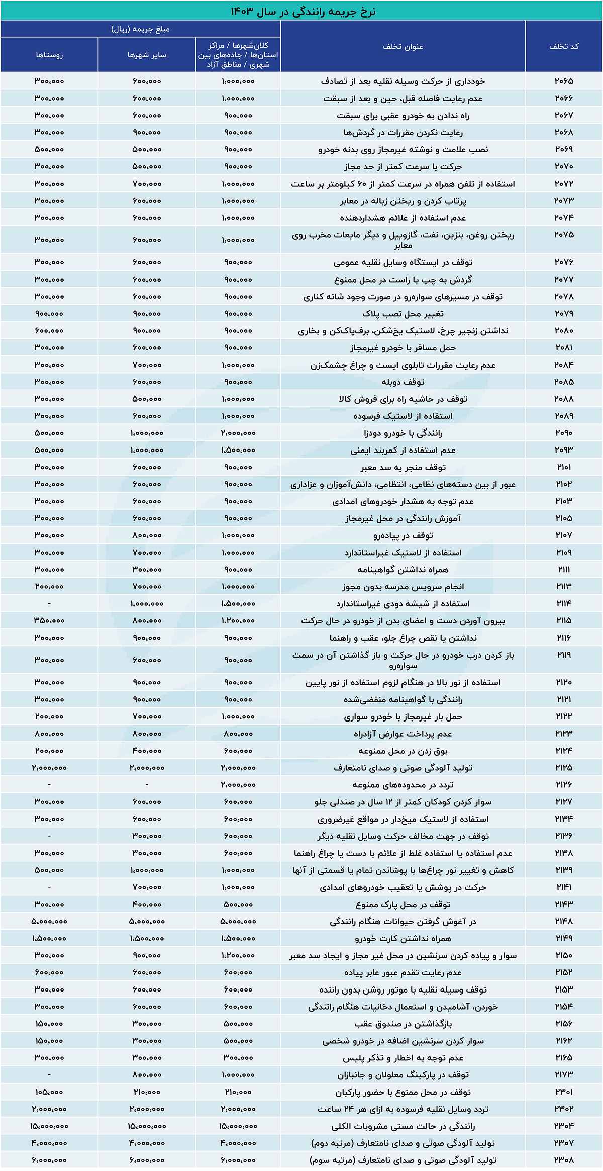 در جدول جدید، برخی مبالغ جریمه برای تخلفات مختلف به شرح زیر تعیین شده است: