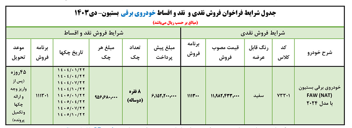 به گزارش خبرنگار پرشین خودرو، طرح فروش نقدی و نقد و اقساط(موعد تحویل حداکثر ۴۵ روزه) خودرو برقی بستیون FAW شرکت ایران خودرو(ویژه متقاضیان سامانه دومین دوره ثبت درخواست خرید با روش اولویت بندی) مطابق جدول زیر از روز یکشنبه ۲۳ دی ماه تا پایان روز سه شنبه ۲ بهمن ماه ۱۴۰۳ ادامه خواهد داشت.