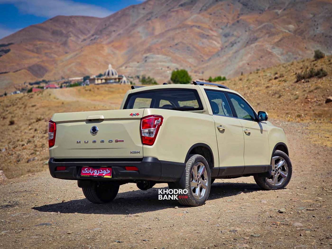موسو گرند خان در رده پیکاپهای سایز متوسط رو به بزرگ قرار میگیرد. این خودرو با طول ۵۴۰۵ میلیمتر، عرض ۱۹۵۰ میلیمتر و ارتفاع ۱۸۵۵ میلیمتر ، از بسیاری رقبای چینی خود ابعاد بزرگتری دارد. فاصله محوری ۳۲۱۰ میلیمتری نیز مستقیماً به فضای جادار کابین، بهخصوص برای سرنشینان عقب، ترجمه میشود. در بخش سیستم تعلیق، KGM رویکردی متفاوت از پیکاپهای سنتی در پیش گرفته است. در جلو از سیستم جناقی دوبل (Double Wishbone) با فنرهای پیچشی استفاده شده، اما در عقب بهجای فنرهای شمش رایج در پیکاپها، از سیستم تعلیق ۵ مفصلی (5-Link) به همراه فنرهای پیچشی بهره برده است. این انتخاب فنی بهوضوح نشان میدهد که اولویت موسو گرند، ارائه سواری نرم و راحت، مشابه با یک SUV، بوده است تا یک سواری خشک و خشن کاری. سیستم ترمز در هر چهار چرخ از نوع دیسکی است، که در جلو از نوع خنکشونده (Vented Disc) و در عقب از نوع دیسکی (Disc) میباشد. این سیستم در کنار مجموعهای کامل از فناوریهای کمکی ترمز، ایمنی فعالی بالایی را فراهم میکند.