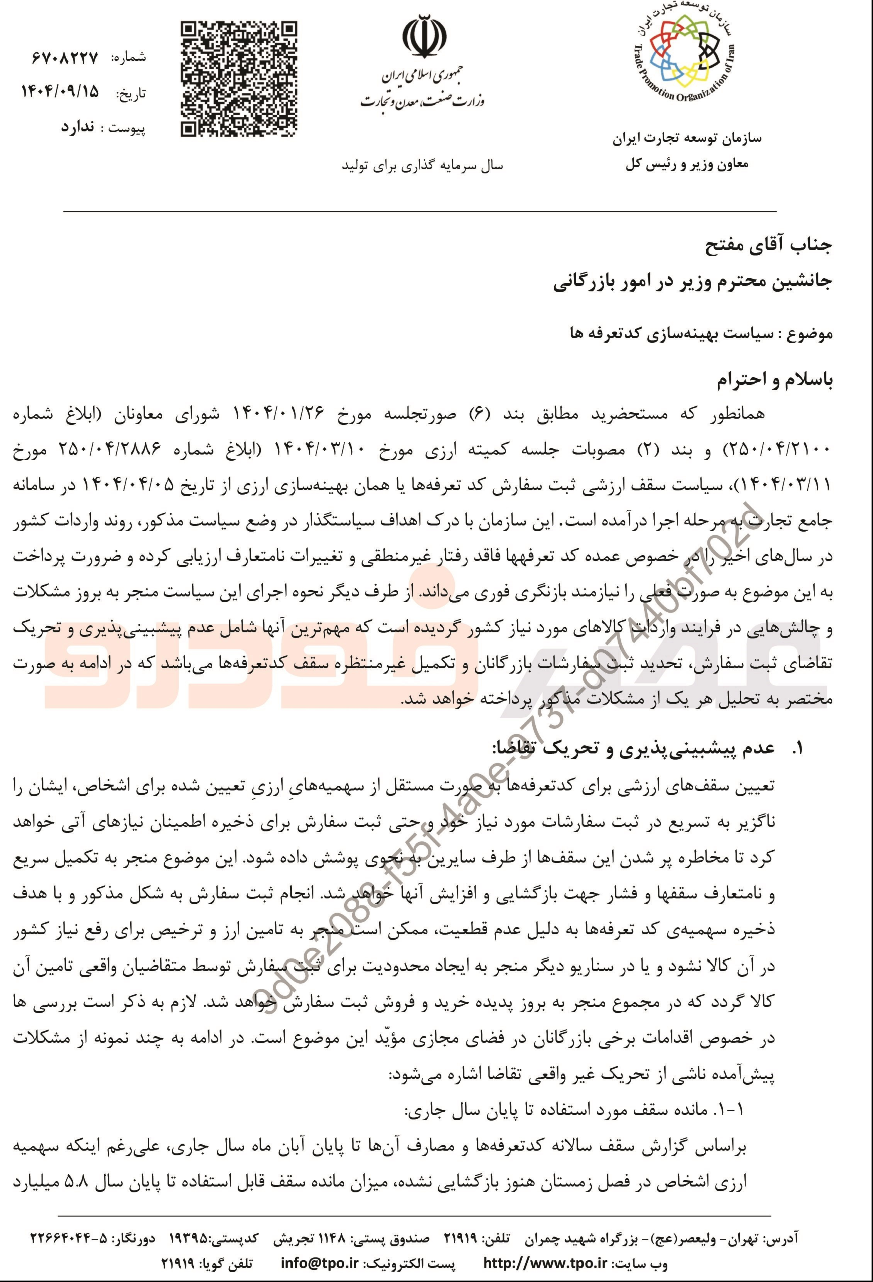 به گزارش پایگاه خبری «عصرخودرو»، در این نامه اشاره شده است که بررسی روند واردات سال‌های اخیر نشان می‌دهد عمده کدتعرفه‌ها رفتار غیرمتعارف نداشته‌اند و اجرای فعلی این سیاست سبب بروز مشکلاتی در فرآیند واردات شده است. مهم‌ترین این مشکلات شامل عدم پیش‌بینی‌پذیری و تحریک تقاضای ثبت سفارش، تحدید فعالیت بازرگانان و تکمیل غیرمنتظره سقف کدتعرفه‌ها عنوان شده است.