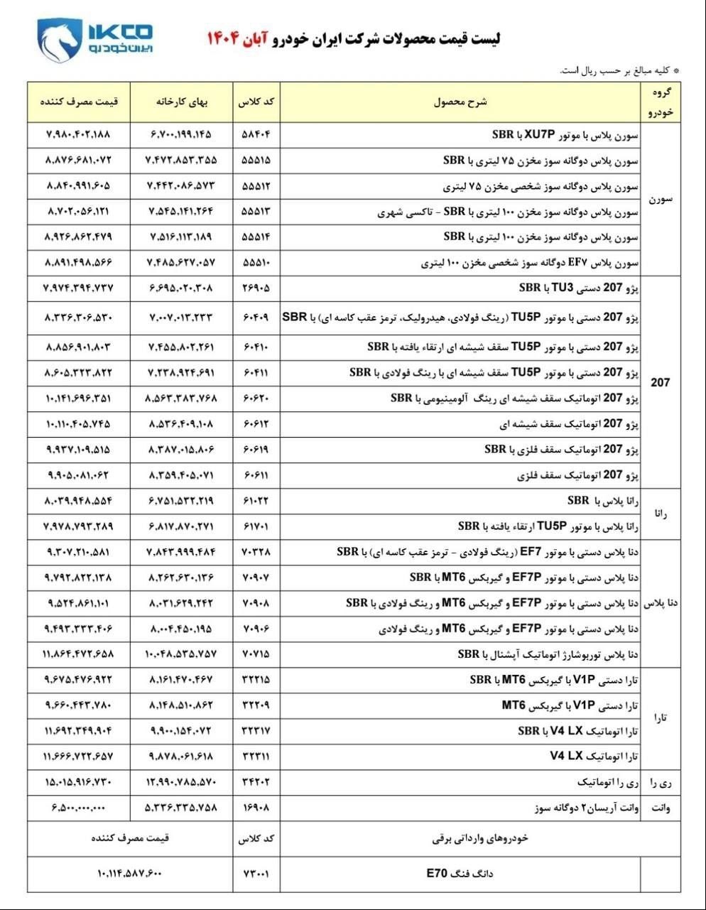 به گزارش پایگاه خبری «عصر خودرو» به نقل از تسنیم، امروز شنبه مورخ 1404.08.03 لیست قیمت محصولات شرکت ایرانخودرو ویژه آبان ماه 1404 منتشر شد.