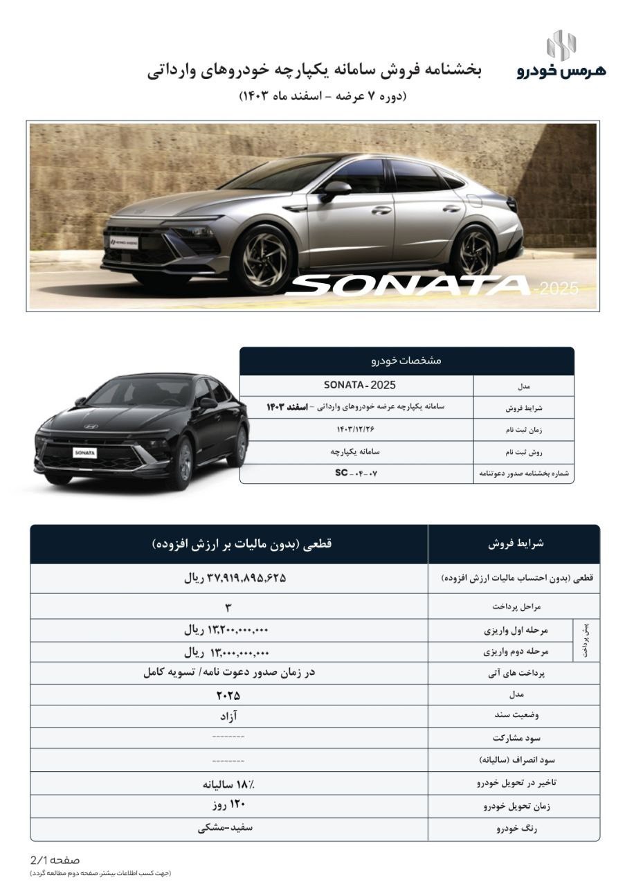 عصر خودرو- شرکت هرمس خودرو طی اطلاعیه ای با اعلام قیمت قطعی هیوندای سوناتا مدل ۲۰۲۵ به مبلغ ۳.۷۹۱ میلیارد (بدون احتساب مالیات بر ارزش افزوده) بخشنامه سری دوم تکمیل وجه خودرو هیوندای سوناتا ویژه منتخبین عرضه اسفند ماه سامانه خودروهای وارداتی با تحویل ۱۲۰ روز کاری را صادر کرد. طی این بخشنامه پرداخت به صورت سه مرحله ای است و پرداخت مرحله سوم در زمان صدور دعوتنامه انجام میشود.